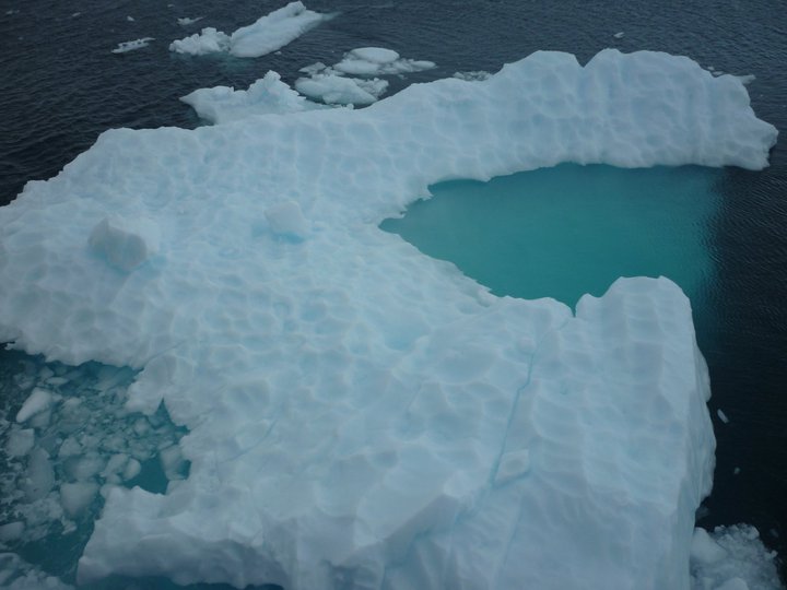 As the iceberg erodes under the surface quicker they become slowly top heavy and start to lean over revealing the layers that make up the ice sheet itself that came off the continent. Some eventually roll over. Apparently a sight to be seen.