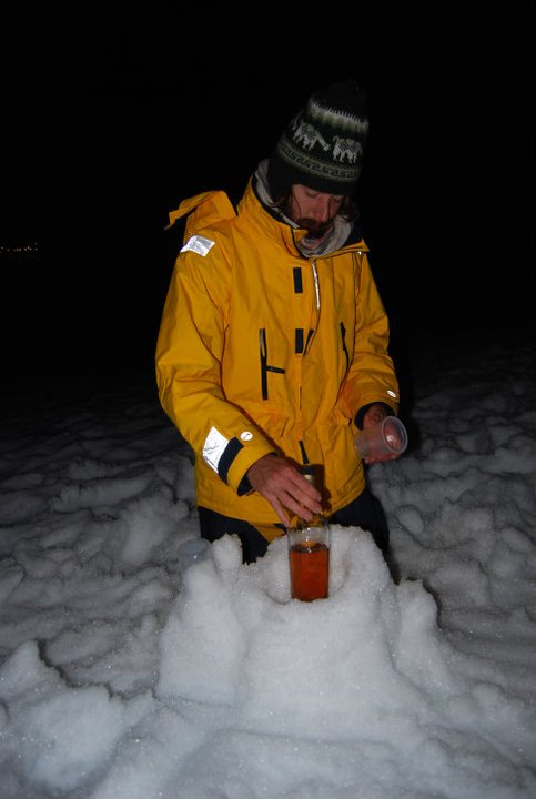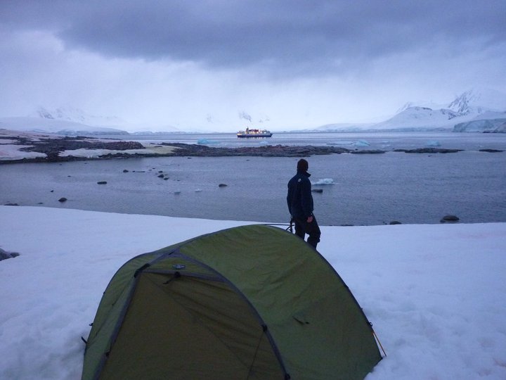 We first begin by leveling the ground for the tent, but keeping enough soft snow to dig our sleeping positions into later. These 3 pole tents are easy to put up and securing the lines into compacted snow with thick iron bars to stand up to unexpected winds was necessary. We built a pile of snow around the tent, continent side to give extra wind protection as cracks and thundering of calving ice sheets sent volumes of ice into the sea, which getting sights of a well lit boat in the fading blue/grey dusk was surreal. Quiet and yet imposing.
