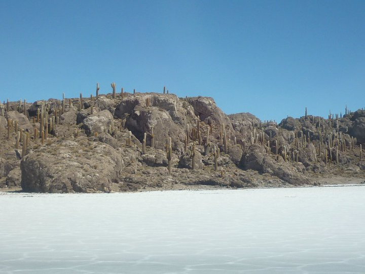 Isla de los Pescados (3653m, 20.243 S, 67.625 W) - The name originates from the fishlike appearance of the island's reflection in the wet season. In July 2006 it was still possible to visit this island, which is an island of fossilised coral covered in 1000-year-old cacti in the middle of the Salar. These cacti grow at a rate of 1cm per year, so you can easily calculate their age.