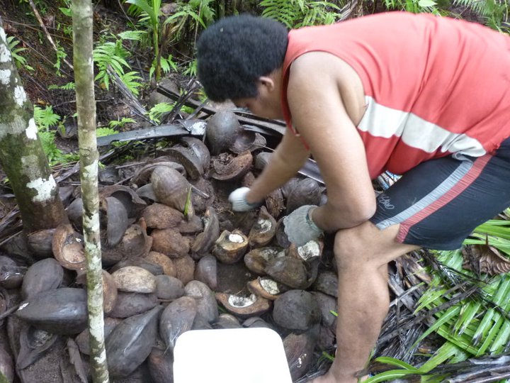 In between she was constantly in the kitchen. Al and I learnt more about tradition Fijian cooking this week that we could have dreamed of. Gella taught us how to catch mud crabs which are abundant on the coast on Qamea. So much so, they were actually a pest as they disrupted land and destroyed crops. To catch mud crabs Gella would set up traps of open coconuts covered with large leaves. The crabs would go and feast on the coconut flesh and then hang out in the cool shaded area that had been created. When the leaves were removed it was a race against time to catch them and toss them into a bucket.