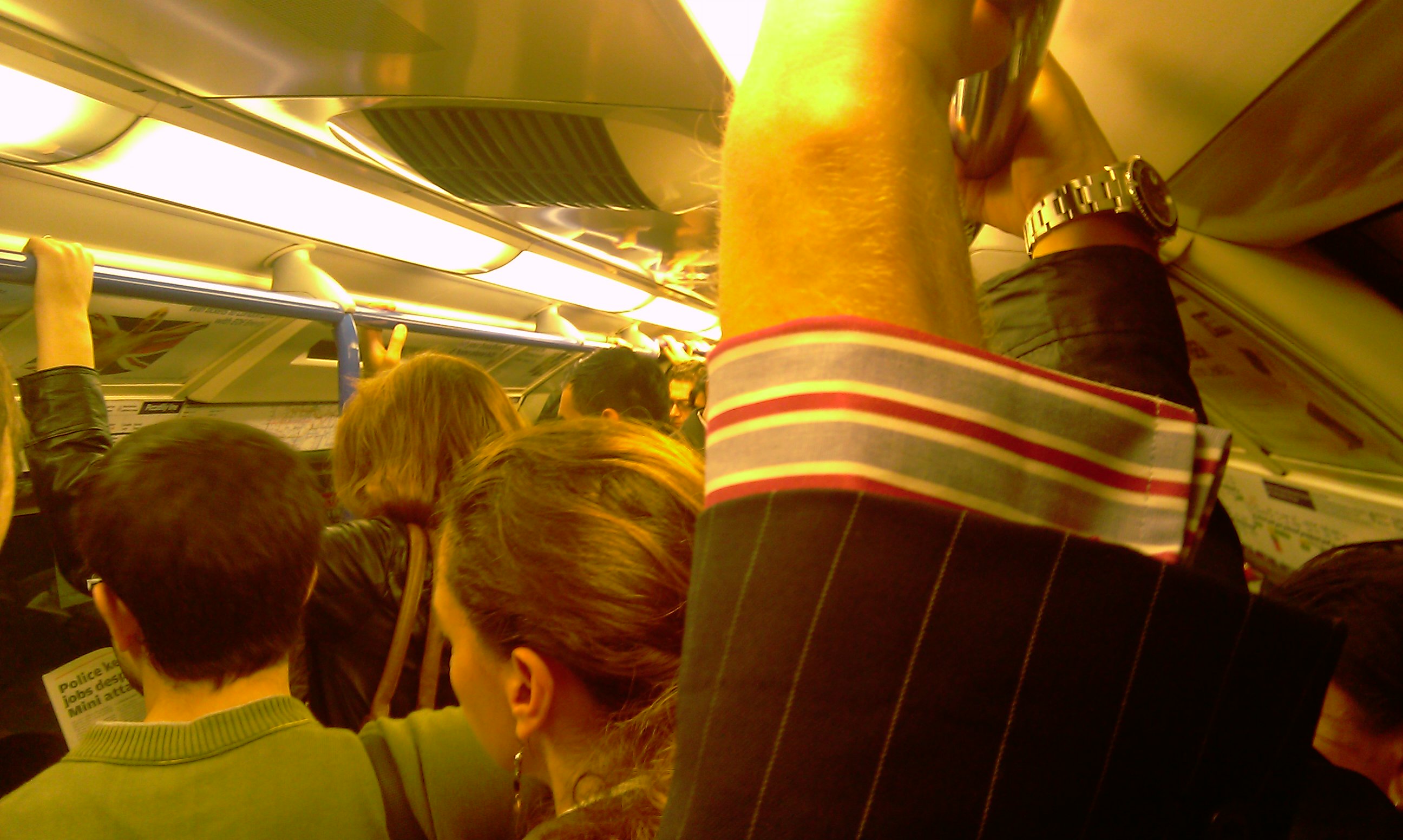 This really is a can of despair. A tin of festering resentment. 6 tubes pass us heading the other way, as an echoed message rattles around the concrete station, apparently apologising for the delay in the service. Usual nonsense that one could barely hear and understand being English let alone a foreign visitor. We eventually piled on, greeted by the free Metro newspaper being strewn all over the place, torn up and trodden into the dirty, wet floor. Within three stops the tune is full and with every stop more and more people cram on, pushing and leaning in as much as possible. My face is in someone's arm pit as commuters look at me in disgust having a large rucksack between my legs like I am a scum bag. "Move down please!" someone cries! "I can't a bag is in the way!" comes a reply about my bag apparently being obstructing. As I gave a loud verbal rebuttal the guy moves around the bag to free up some space.