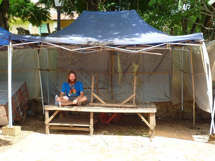 hurting him when he put weight on it. We decided it was just badly bruised and so rented out some push bikes (10,000kip per day) to take the weight off. It was definitley the way to get around Luang Prabang. It gave us mobility that otherwise would not have been possible with Als foot. A very slow day indeed, we mooched down to the riverside and picked up our usual iced coffee fix (5000kip if you buy it at the riverside) and a baguette sandwich (10,000kip-25,000kip depending on the filling). We sat on an unoccupied market stall in the shade and watched the world go by. The heat once again was stifling. Along with a hangover, it was difficult to do much. We went to Jan's office to finish off the document for him and went for dinner on our own at the night market. It had an amazing selection of food and we opted for a selection of vegetables and noodles (as much as you can fit on a plate for 10,000kip). It was the cheap and quick food that we needed. Then to our bed for an early night. We felt drained from the late nights after the 3 weeks of hard labour in Hatsa.