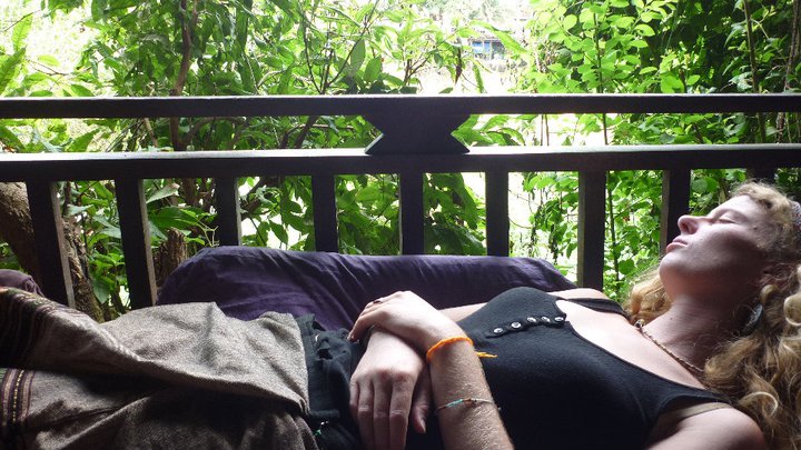 a riverside bar/restaurant that we had heard about. It was owned by the same lady as La Pistoche and we had heard that it was a nice place to lounge next to the river, on the otherside to the rest of Luang Prabang. We showered off in the toilet and enjoyed a lounge booth set on stilts amonst trees in a secluded river spot. The menu was expensive but it was an idyllic spot to relax, cool down and rest before going back to town. It was 'our pick' in Lonely Planet, which we were both shocked by considering how expensive it was.