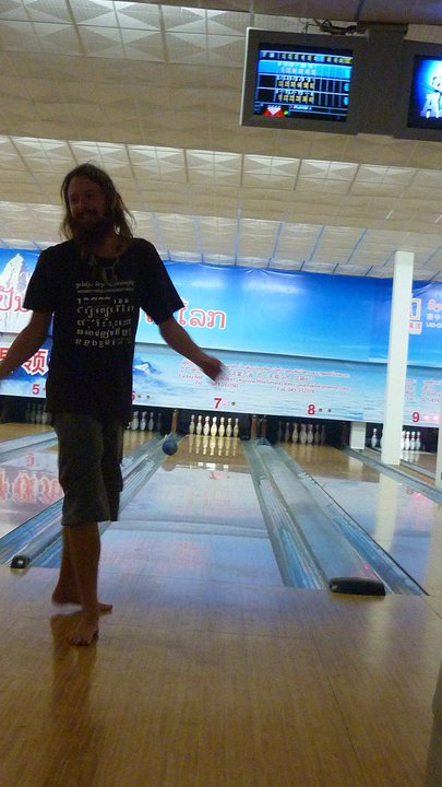 Whilst a songthew waited patiently for us, Al and Jan had to lift the bike over the gate because it had been locked up for the night (11pm is late in Laos). Jan was acting like an old man and so Al tried to help him out by being the one to jump over the gate. On his way back to the Songthew he jumped off the fence and landed hard in his falling appart plimsoles. He landed funny, but with the beer flowing he didn't realise what damage he had done to himself. The set price for a Songthew to the bowling alley is around 100,00kip. This was the most expensive aspect of the jaunt because to play bowling was only 15,000kip each, as was a bottle of Beer Lao. We had a merry night. Al and I were really bad at bowling and Jan thrashed us. Beer goggles does not help bowling skills we decided!