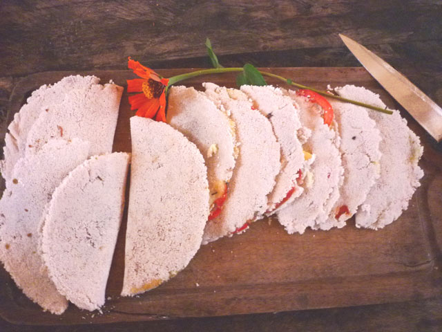 The starch is mixed with a little water before being sieved into a frying pan until it forms a thin layer of the starch. This glues itself together to form a thin tapioca pancake. Cheese, tomato, herbs and ham is added as a filling. Tapioca's slightly fermented taste gives these pancakes a new savoury dimension that is really delicious.