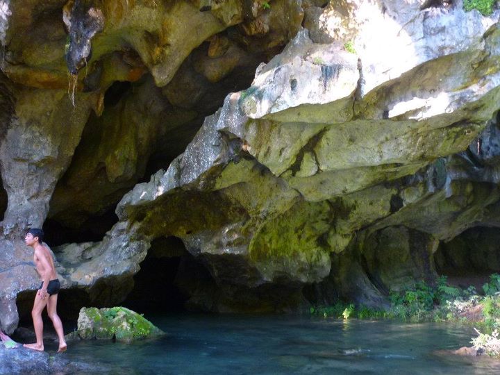 We negotiated as much mud as we could before needing to take our shoes off and faced the squelching faeces-clay through our toes before we reached a clearing and paid the local Kamu tribe a fee to visit the Tham Kaang cave. We were all sweaty as we de-robed to swim wear and hesistated before lying down in the crystal clear, icy, spring water. Heaven. The cave itself was awesome as the water gushed upwards from underground with enough force to fountain upwards a meter or so. Deposits left intricate designs and colours on the walls, as stalactites obscured the sun’s entrance into the dark cavern.