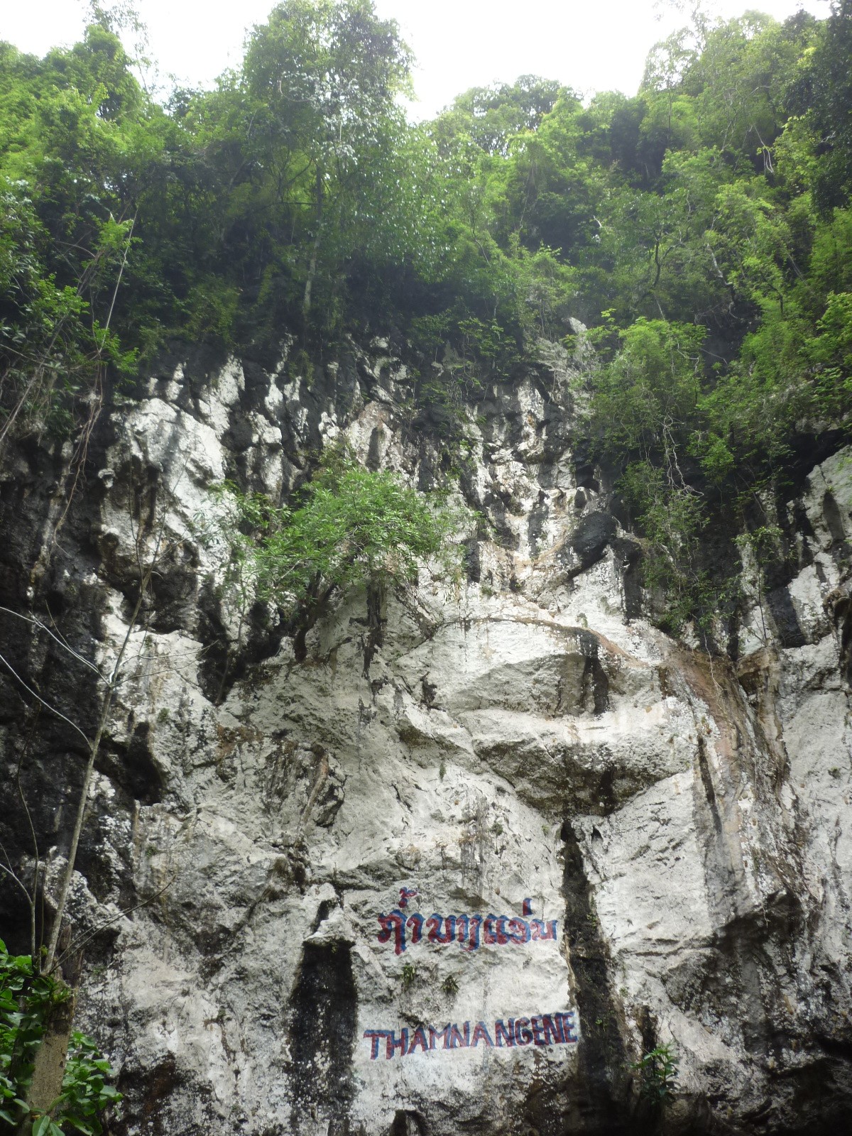 Deeper into the cave the light from the outside was replaced with coloured fairy lights installed to help peopl find their way. The rock formations were smooth and it was evident where currents would gush through the voids when te space was flooded. The boat was worth taking. We went deep into the cave where there was no light at all, only our torches. The only other light we saw was sparkly fragments on certain areas of rock. On closer investigation the sparkly textures appeared to be insect larvae, many little flies that had already hatched surrounded us in a cloud and followed us when we tried rowed away. Dripping sounds from fresh water finding its way though cracks in the rock into still pools below were pronounced echoes added to the mysterious atmosphere of the beautiful void in the protruding giant rock that occupied the landscape. After the boats dropped us back on a wet rocky surface we continued through different caverns, before long finding natural light once more. This exit brought us high onto the rock. A hair raising climb down on moss covered rock brought us back to the entrance to the cave. Happy and fullfilled with our caving and difficult rock climb we all set back toward the tuk tuk.