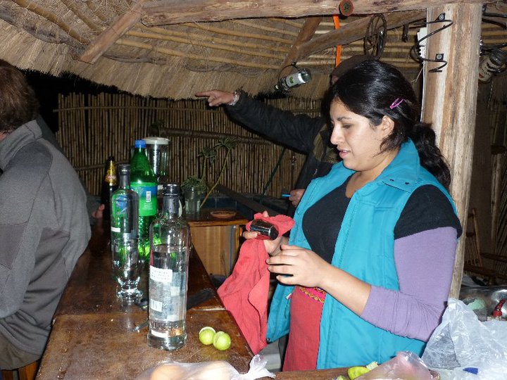 Later on after dissecting the local populace we sat on the roof with a beer in the scorching sun and was soon joined by the bar lady, called Adriana, who we immediately learnt worked during the week to supply the small number of people currently using it. That turned into a Pisco Sour making event, with some Americans and ''Chet'' the biking tour guide. We sunk 2 bottles of different kinds of Pisco and Laura learnt and began making them herself. We were then invited to go to an ex-pat leaving party and joined a group of 15 westerners who were all volunteering for Awamaki, a charity to support the local, traditional methods of weaving. This young ex-pat community tended to hang around and drink together in their time off, a temporary permanent group who often knew each other from years past, but who were all ultimately transient and had "real homes". A new lifestyle for sure, one that is dynamic and changing, you experience a lot and then leave it all behind. It must be strange, but it was good to meet the guys and hear of the wide stories of people's backgrounds, all congregated under the stars in another remote place. We stayed until we pretty much couldnt really see that much and didn't really want to feel too bad for our next day at work, so soon into proceedings.