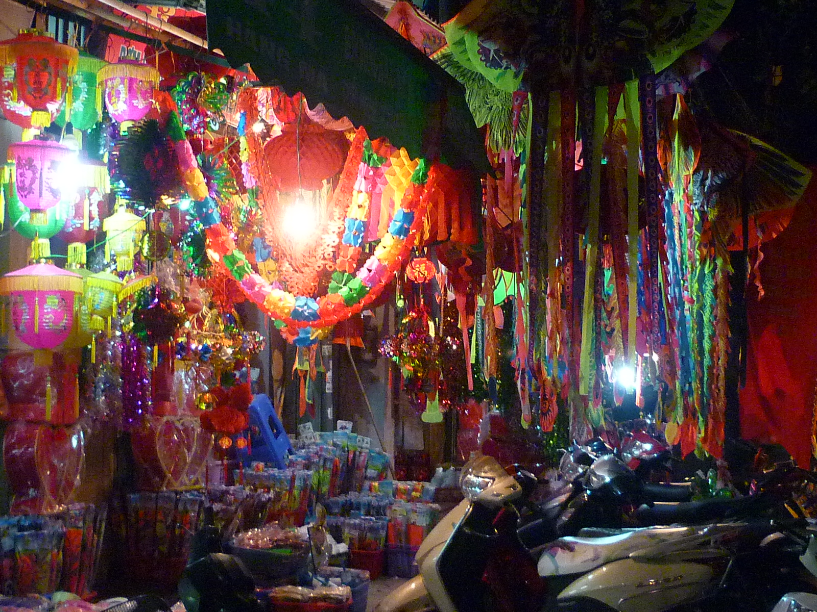 Retiring to our hotel for a rest before night we enquired as to where the local food was served and in addition were directed to a night market. The market street was ablaze with colour, lanterns, kites, cheap clothes, food stalls all intermingled.
