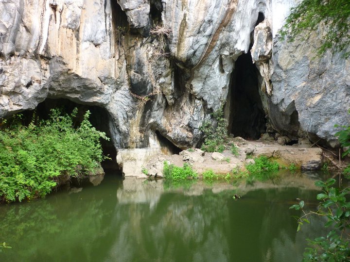 With not much time to play with before heading back to Kampot to catch our bus, we decided to go little further around the base of the mountainous rock. To get there we passed over a rickity bridge and before long we happened upon a cave and pool of water.No one else was there, not even local kids trying to be guides. It was a beautiful spot. The main entrance to the cave was a shrine with a wooden ladder leading up from the pool. We enjoyed this spiritual place all by ourselves before heading back for breakfast at Chims's and catching our bus back to Phnom Penh.