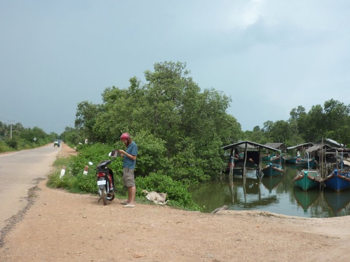 As we descended it felt like we were off road all together winding through rubble land scattered with spiky bushes. We continued on what we could make out to be a path hoping that it would turn into a larger track once we reached the flat plains of paddy fields. It did for a little while so we were encouraged to take this path. Plus our fuel was looking low and taking our bike back over the mountain past the lake seemed like a bad option. The track widened slightly but as we reached the padi fields, dotted with stilted houses the track got very muddy with parts impassable with large puddles. We asked a few curious locals for Kampot who did a kind of wiggle with their arms pointing vaguely across the expanse of padi fields. The paddy fields were impassable, full of water. The only way was to navigate around them on the narrow ridges bordering the fields. So we began our pursuit. Locals working in the fields stopping to stare, sometimes waving and shouting 'Sousaday!' We kept getting to dead ends on the ridges, unable to turn around, we were forced to go forward sometimes into the water momentarily to reach the next ridge. I was not strong enough to help Al with this and I could only help by holding the front wheel as he lifted the bike over the best he could. We were really scared of flooding the engine. The best I could really do was run ahead and scope out the best route along the ridges and shout directions back to Al. It was a fun adventure but at those moments it was a little unnerving with drizzle beginning to come down. It was not an ideal place to get stuck. Eventually we navigated ourselves and bike to a house with land around it. Now where?? A group of local ladies had started to follow us and they directed us through someones garden until finally we found a road leading in the general direction to Kampot.