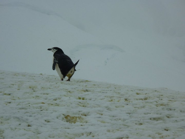 Another short trip SW down the coast to Petermann Island, which Adelie penguins also leave earlier than the Gentoo's are not found and have already moulted and left for the year out to sea. From this rock landing, which is fairly trecherous given the snow fall and choppy conditions we walk parallel to a clear penguin pathway. This is made by the adults as they come back from feeding in the sea, walk up the hill to the rocks on top that provides shelter and is a distance away from the sea-based penguin predator - the leopard seal. Remains of penguins turned inside out are the visual remains of those that didnt make it, half buried under snow and only decomposing after the Skuas had piked their remains clean. With flippers held behind them for balance as the parents waddle up hill comically and in numbers. We join them at the top, another nesting site that stinks of dead/decomposing fish from penguin faeces, something David Attenborough never mentions in the documentaries.