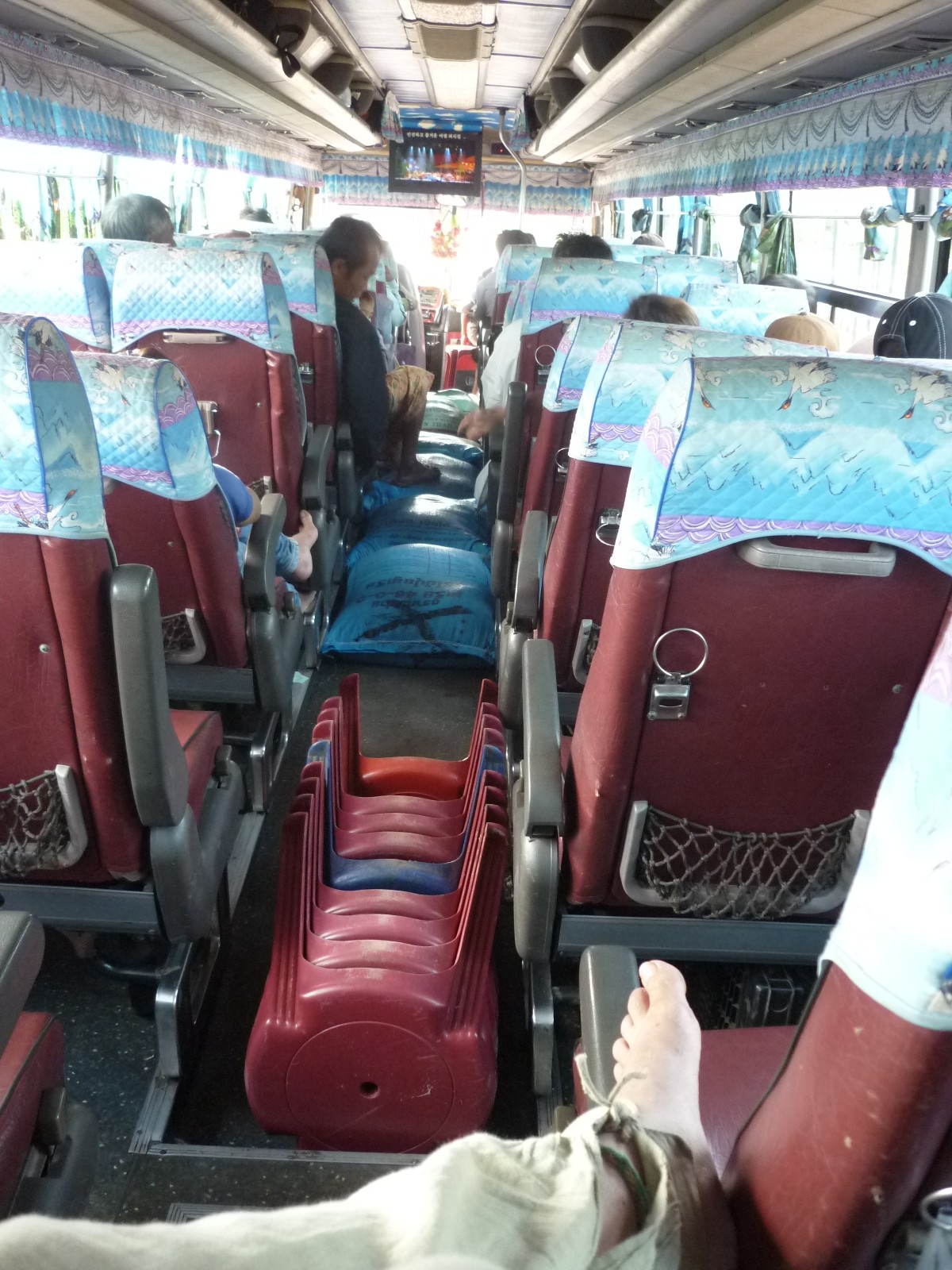 The bus was busy but not full so I chopped and changed seats to enjoy the view and avoid the blast of dirty aircon which particularly dominated our seats. No sooner the bus would start driving, it would stop again to pick up and drop off people; or just stop to allow the engine to cool down a little. It crawled all the way to Savanahkett for 8 long hours. Here we were one hour away to the 10hours we had been quoted. Unfortunately we sat there for an hour with more loud music and videos before the bus final left to Thakek. The bus was now ramed, perhaps the last express bus of the day? The bus certainly changed gear and sped up for the remaining journey until we finally pulled into Thakek station. With a huge sigh of relief we dissembarked. Our next mission: Tuk tuk, find a bed, cold beer.Enjoyed this story?