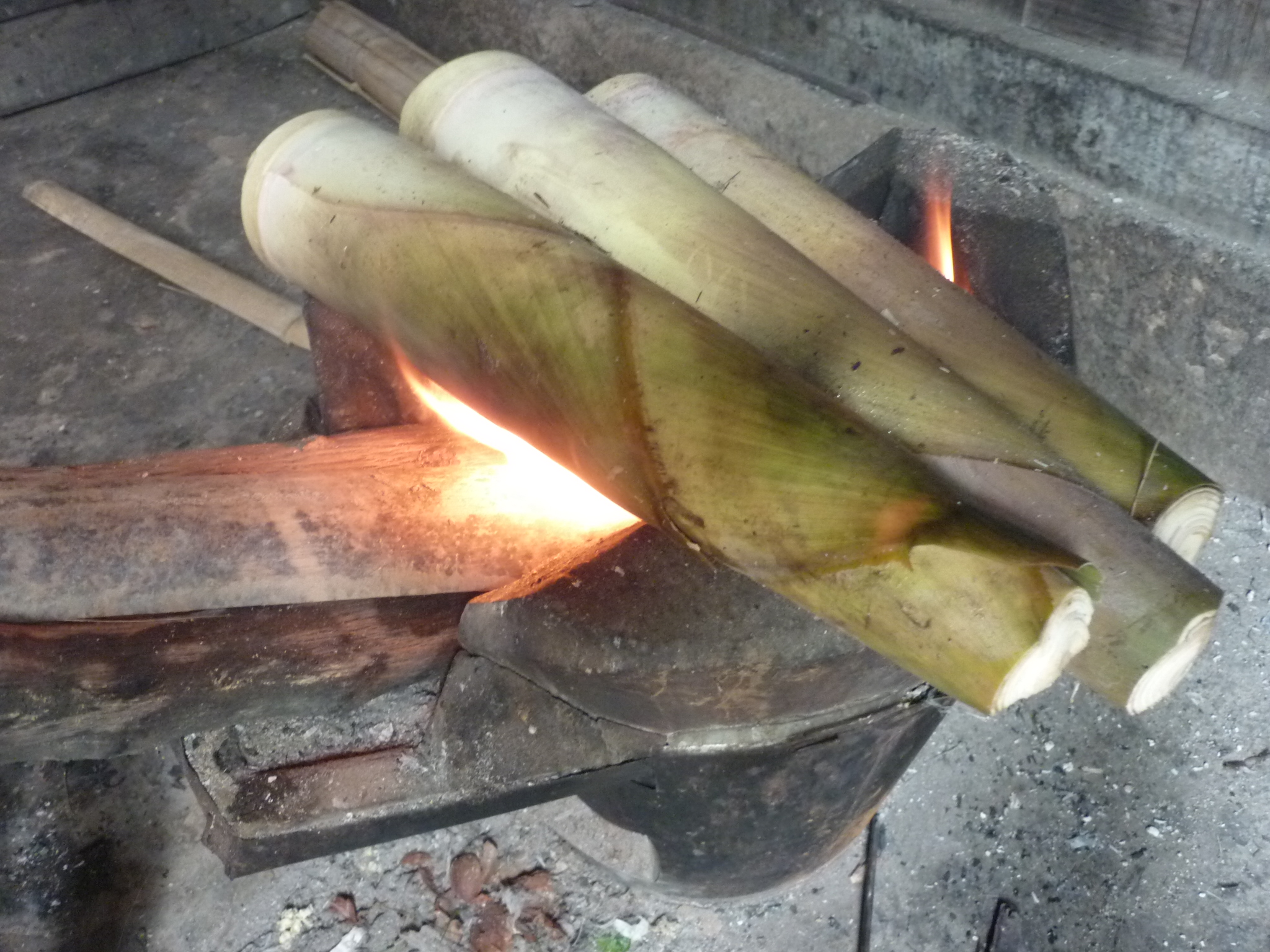 Initially the outer skin of the bamboo is burnt in an open fire. This burns off the small hairs that are an irritant and produce a rash if handled with bare hands. Then the bamboo is trimmed to the point where resistance from the fibres is low enough and boiled for 4- 5 hours.