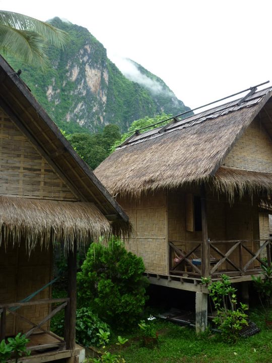 After 3 hours we hit the start of the dirt road and after an hour of rumbling along, passing rice cultivators with their massive blades, my head nodding painfully on the seat in front we reached Nong Khiaw. Jan expertly organised a tuk tuk to the other side of the river where the town was with the other travelers in the minivan and for 5,000 kip each we were dropped in the centre of town in 5 minutes, on the bank of the large Nam Ou river, where even more impressive peaks overwhelmed us. We headed directly to Meexai Guesthouse that has bungalows made from bamboo on stilts for just 20,000 kip per night for the whole place. Flowers and grass