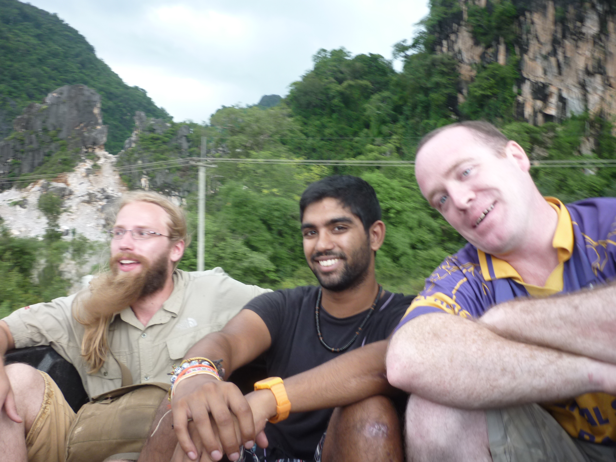The Aussie and French guy ended up deciding that this adventure was not for them and they bailed from the songthew making it a bit more comfortable and a little easier onthe engine. Within 5 minutes after saying goodbye we experienced our first breakdown. The chain had fallen off but luckily this was easily fixable. Lorenzo and Janny (the Finnish guy) and professed their individual ambitions to do a road trip in a tuk tuk somtime in the futre, this also being an ambition of mine and Als, we all relished in this breakdown. We watched carefully enjoyed our first bit of tuk tuk 'training'! Back onthe road again we chugged on until we were out of town and enoying breathtaking scenery. Weaving and winding on smooth tarmac roads with backdrops of incredible bright green paddy fields with huge sheer rock faces jutting out of from nowhere. The vew made me think of what I always imagined a lost world to look like. With every twist and turn in the road another view would emerge keeping us entranced. Al ad I who were sitting next to the driver had the best view and we realised that this was a fantastic opportunity for making the most of Thakhek. We would not have been able to see the area if it had not been for everyone sharing the songthew with us.