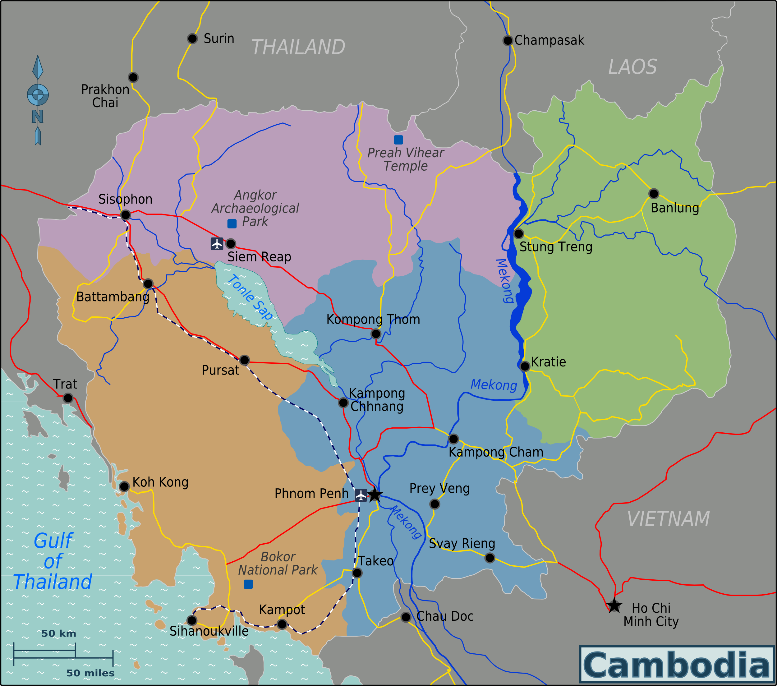 The railway network operates between capital to Sihanoukville on the southern coast, and from Phnom Penh to Sisophon (although trains often run only as far as Battambang). To get to Cambodia via Vietnam there is a long boat ride of 5 days, but it is tough going and you do not see much scenery. There are Mekong cruises, but unfortunately these are more pleasure, let's go round in a circle affair, rather than to travel from A to B to Cambodia from Vietnam itself. You can go to the boarder by bus. Ho Chi Min to My Tho, My Tho to Can Tho, Can Tho to Chau Doc. Then you can take the fast both taking 6 hours to Phnom Penh, which takes in the Mekong in Vietnam before heading to Cambodia. Phnom Penh to Siem Reap, Phnom Penh to Battambang and Phnom Penh to Sihanoukville are tarmac and so do not suffer from flooding, but the rest can turn to mud in the rains and travel is much slower. Local buses can be uncomfortable, but the GST (cheaper) and Mekong Express are of a better quality if you can afford it and have a long distance to cover. Taxis are not commonly seen, but can be arranged to an extent, some can be shared and then more longer distances can be achieved at a fairly low cost. Renting motobikes in Cambodia is easy and cheap. Note that road accidents here are the highest in the world and rules to the road are unwritten. Pay close attention to traffic at all times and do not drive at night unless you must. It is always worth noting motorbike hire is actually illegal for tourists in Siem Reap. It can be done, but here is less worthwhile than other places. Ferries operate seasonally along many of the major rivers. However boat travel is usually a more expensive than the bus, but involves some beautiful scenery through the Mekong Delta, passing small villages. Outboards depart from Kaam Samnor border located near the village of Vinh Xuong, a minibus journey from Chau Doc itself (US$2). The journey takes about an hour and a half and one boat is approx US$20, or US$4 if you go on a shared boat which will leave when full. There are generally two routes heading north in Cambodia and that is highway 5 to the West of Tonle Sap lake or highway 6 to the East of it. With plenty of time you can travel in a large loop on dirt roads around the East and North-East, but the west isWhere to visit: